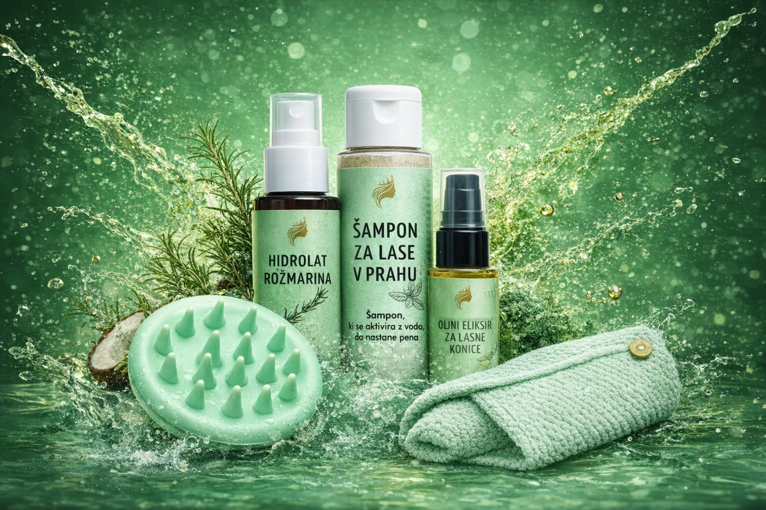 Šampon v prahu, hidrolat rožmarina, oljni eliksir, masažna krtača in mikrovlakenska brisača v eni elegantni Kraljična kolekciji.